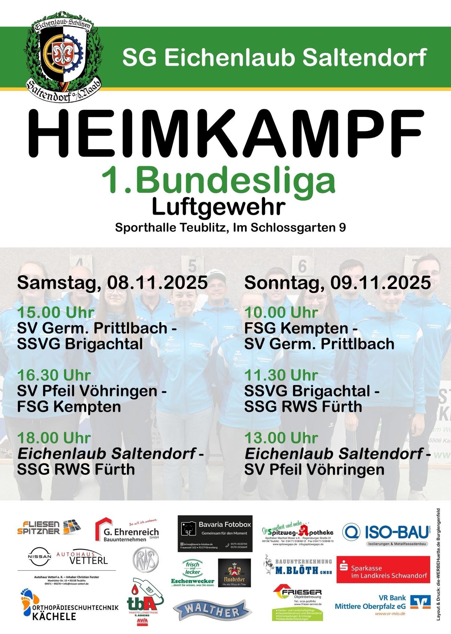 An diesem Wochenende, Samstag, den 08.11., und Sonntag, den 09.11., findet in der Dreifachturnhalle in Teublitz der Heimkampf der Bundesligamannschaft von Eichenlaub Saltendorf statt. Für alle Besucher besteht die Möglichkeit, mit dem Lichtgewehr zu schießen. Außerdem steht eine Scatt-Anlage zur Verfügung.